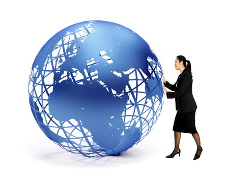 Business woman pushing a blue globe isolated
