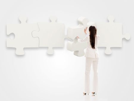 Business woman putting pieces of a puzzle together - isolated over white