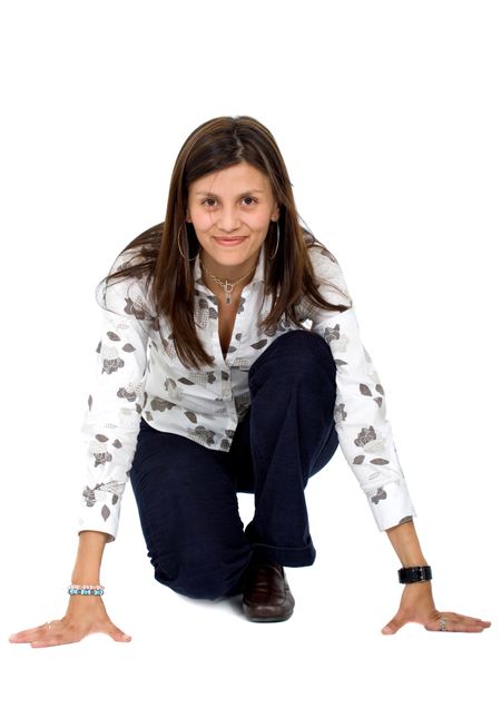 Business woman ready to race - isolated over a white background