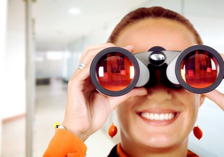 business woman searching for a job in an office - looking through binoculars
