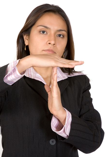 business woman signaling time out with her hands on a white background
