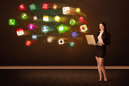 Business woman sitting in office chair with laptop and colorful app icons concept on background