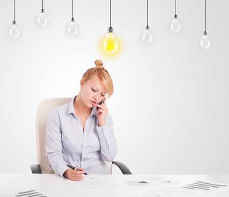 Business woman sitting at table with bright idea light bulbs