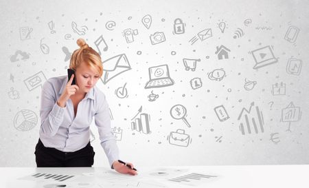 Business woman sitting at table with hand drawn media icons and symbols