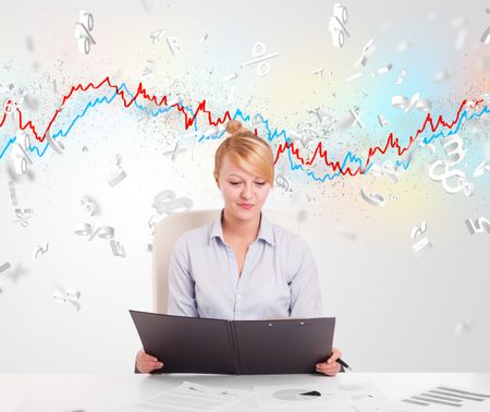 Business woman sitting at table with stock market graph 3d letters