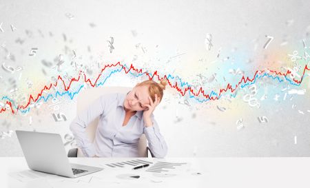 Business woman sitting at table with stock market graph 3d letters