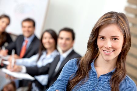Business woman smiling leading a team during an office meeting