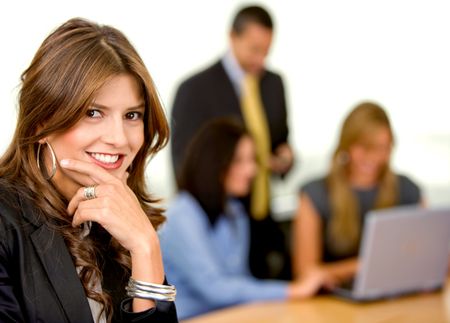business woman smiling with her team in an office