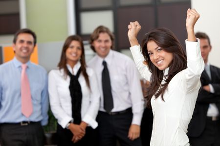 Business woman smiling with her team behind her at the office