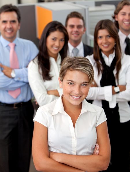 Business woman smiling with her team behind her at the office