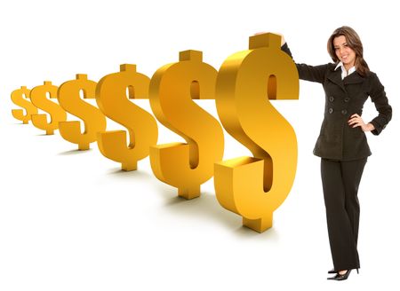business woman standing with dollar symbols isolated over a white background