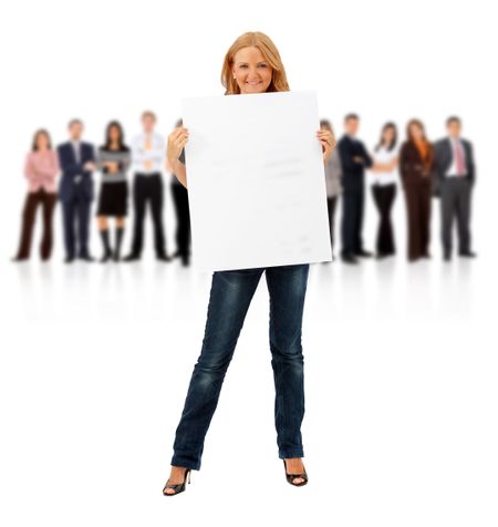 Business woman standing holding a banner with her teamwork behind isolated on white