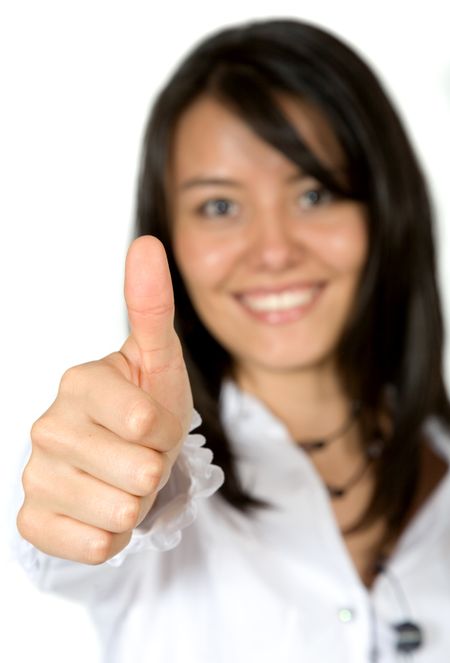 business woman with thumbs up over a white background