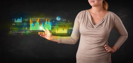 Business woman touching colorful charts and diagrams