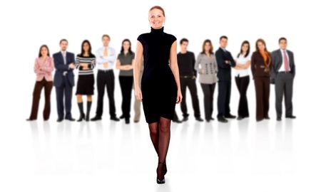 business woman walking and leading the team in front of the group isolated over a white background