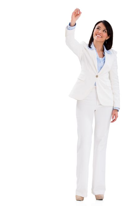 Business woman writing with a pen - isolated over white