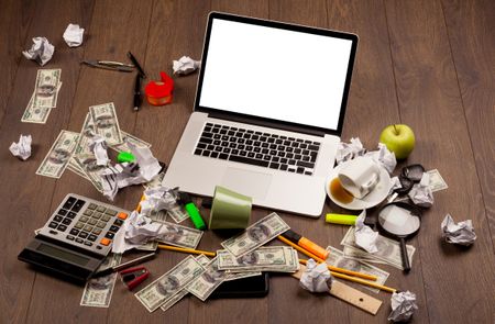 Business wooden desk with office supplies and modern laptop white background