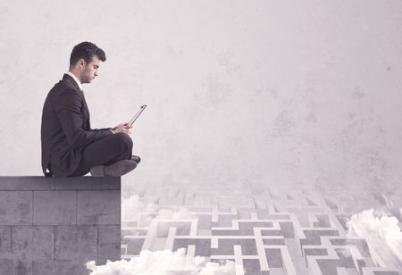 Business worker sitting on concrete building edge, thinking of solving a maze concept with labyrinth and clouds