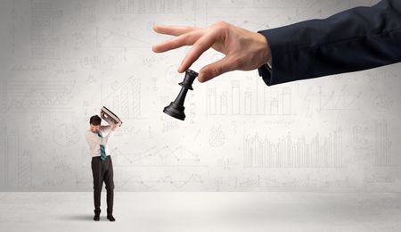 Little businessman is afraid to make the next step in his chess game with graphs, charts and reports background