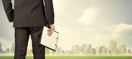 Businessman from the back in front of a city view with clouds and grass