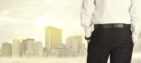 Businessman from the back in front of a city view with sunshine