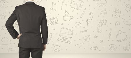 Businessman from the back in front of an social media icon wall