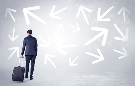 Businessman with back walking away with higgledy-piggledy arrows around