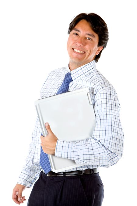 Businessman carrying a computer looking happy isolated on white