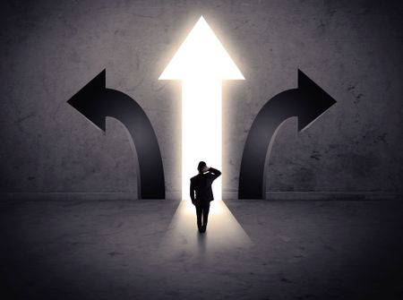 A businessman in doubt, having to choose between three different choices indicated by arrows pointing in opposite direction concept
