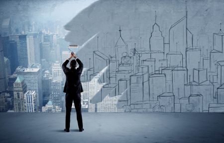 A businessman in elegant suit holding a paint roller in his hand and painting drawn city landscape over urban skyscrapers concept