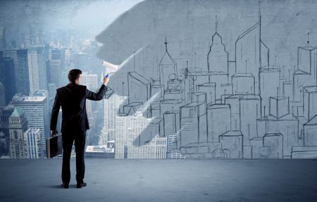 A businessman in elegant suit holding a paint roller in his hand and painting drawn city landscape over urban skyscrapers concept