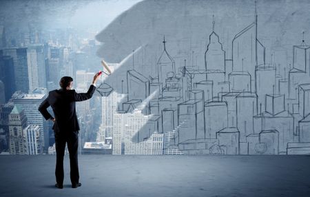 A businessman in elegant suit holding a paint roller in his hand and painting drawn city landscape over urban skyscrapers concept