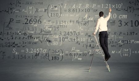 A businessman in elegant suit standing on a small ladder and writing numbers, calculating on grey wall background