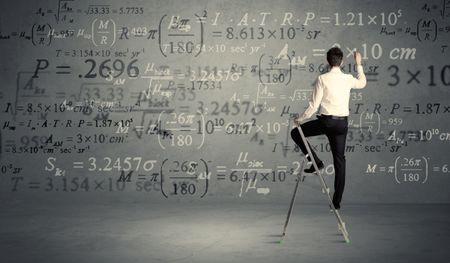 A businessman in elegant suit standing on a small ladder and writing numbers, calculating on grey wall background