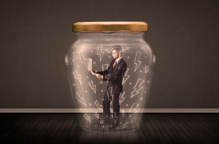 Businessman inside a glass jar with lightning drawings concept on background