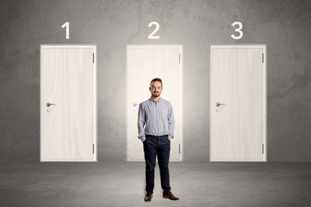 Businessman in grey room with three numbered white door behind his back