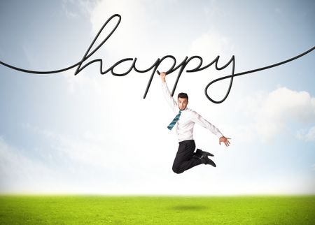 Businessman hanging on a happy rope
