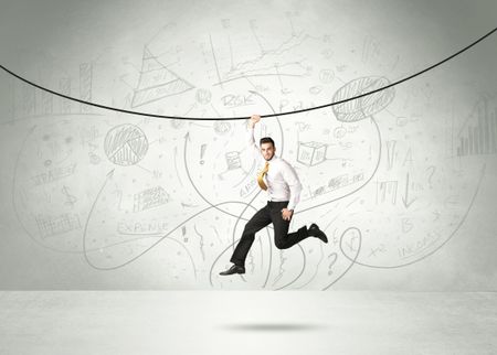 Businessman hanging on a rope with analysis and graphs background