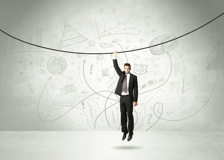 Businessman hanging on a rope with analysis and graphs background
