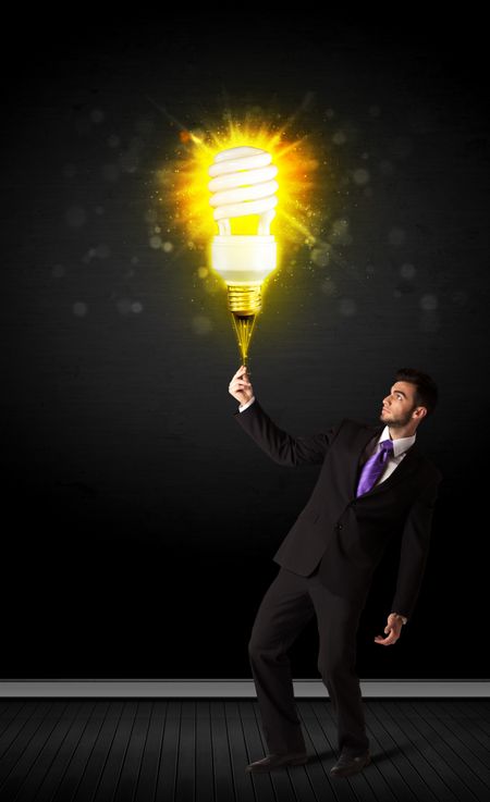Businessman hold a shining eco-friendly idea bulb on a black background