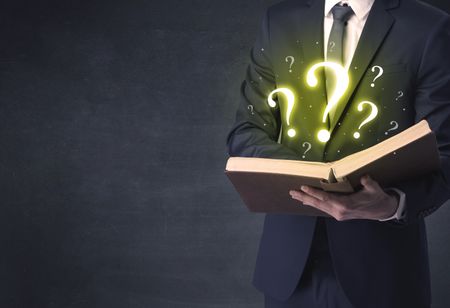 Businessman holding a book with question mark symbol.