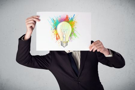 Businessman holding a cardboard with coloured paint splashes and lightbulb in front of his head