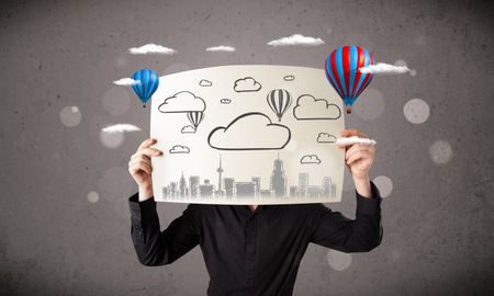 Businessman holding a cardboard in front of his head with cityscape and ballons drawing