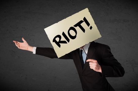 Businessman holding a demonstration board with riot sign in front of his head
