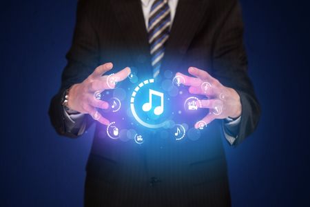 Businessman holding digital multimedia icons