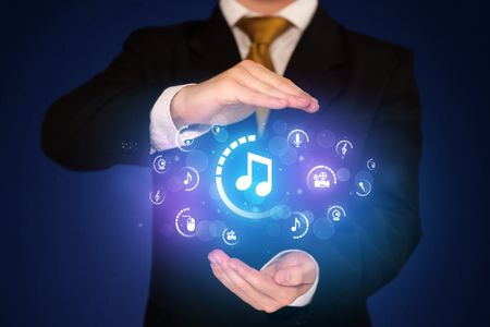Businessman holding digital multimedia icons