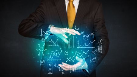 Businessman holding hand drawn business schemes