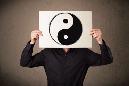 Businessman holding a paper with a yin-yang symbol on it in front of his head