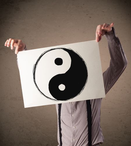 Businessman holding a paper with a yin-yang symbol on it in front of his head