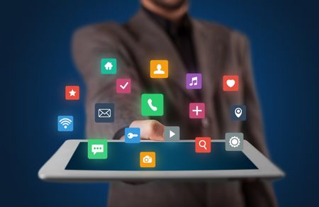 Businessman holding tablet with colorful applications